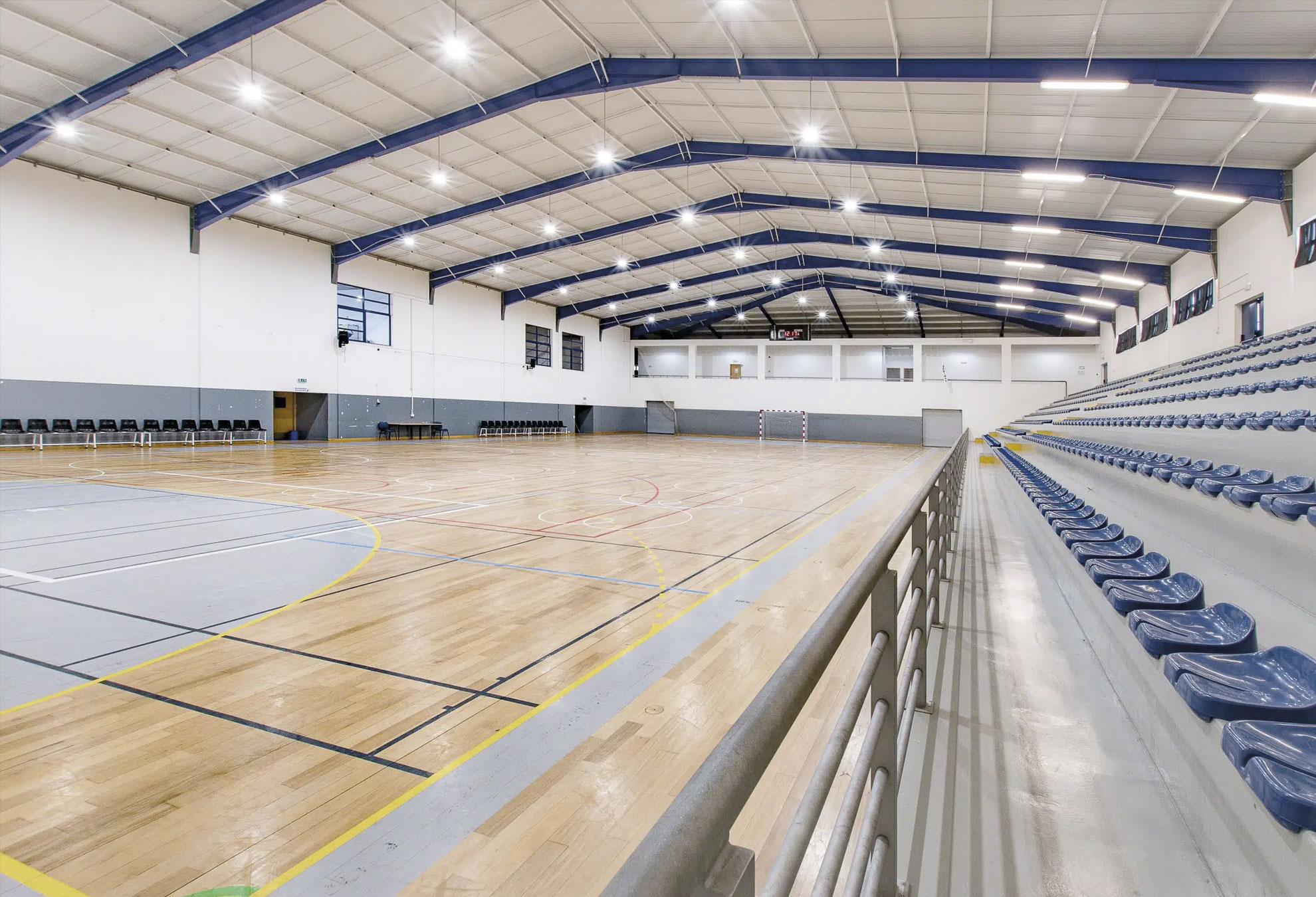 Pavilhão desportivo polivalente com dimensões regulamentares, preparado para a prática de diversas modalidades como futsal, basquetebol, voleibol e andebol. O espaço dispõe de piso adequado, marcações oficiais, tabelas, balizas e bancadas para público.