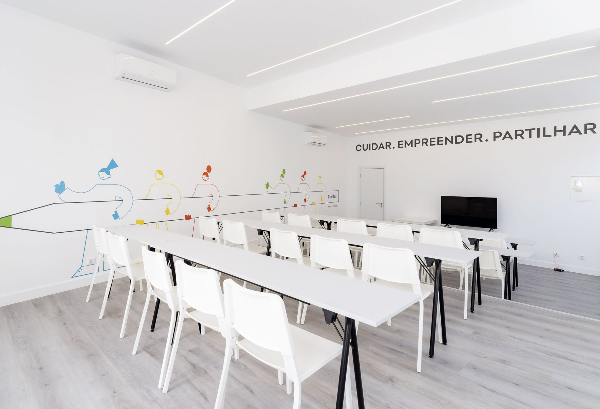 Salas de formação e reuniões versáteis, preparadas para acolher sessões de trabalho, workshops, ações de formação e encontros institucionais. Os espaços são configuráveis, permitindo diferentes disposições conforme a necessidade, desde reuniões mais reservadas a sessões com maior número de participantes.